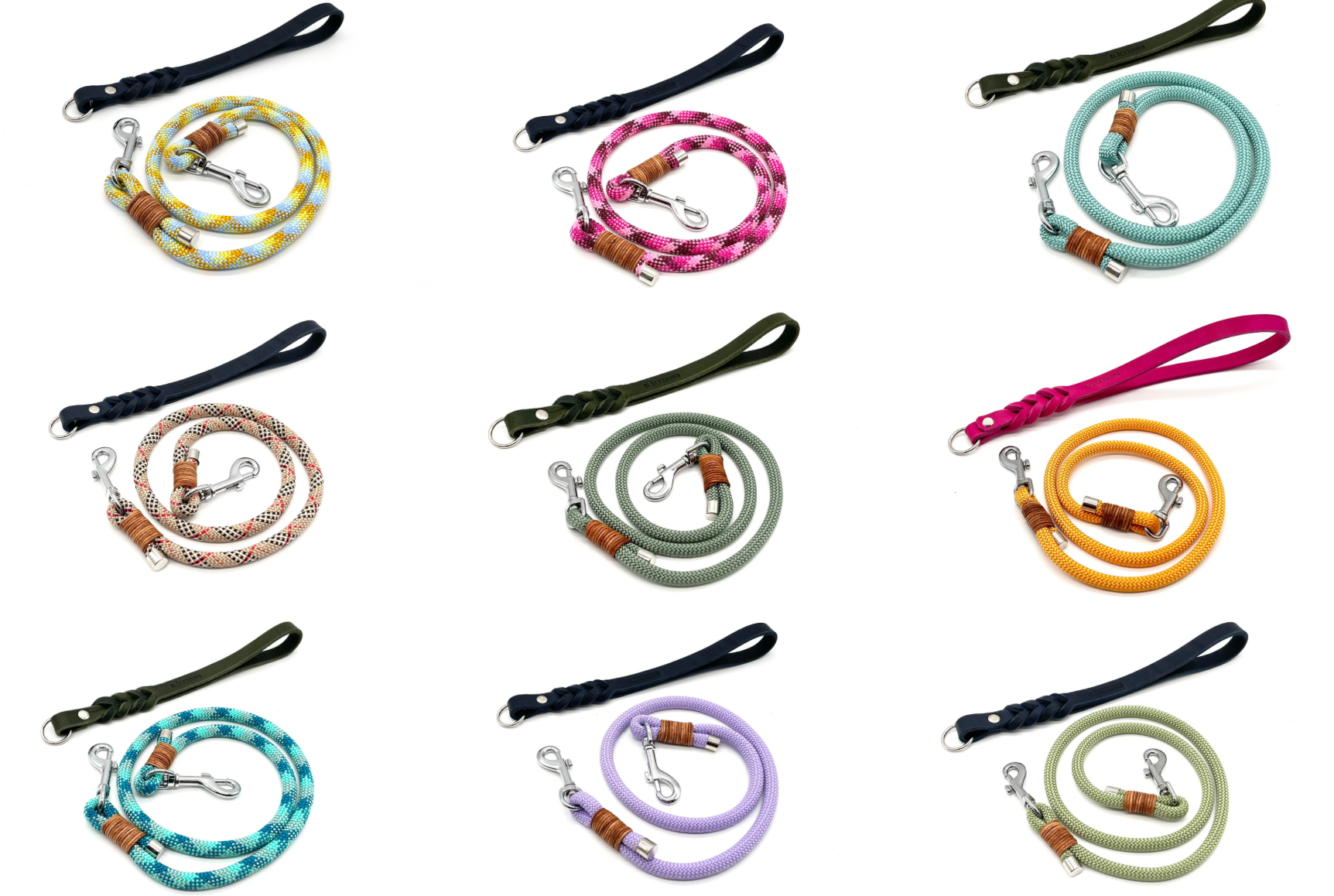 Die Leine besteht wahlweise aus einer Handschlaufe oder Schlaufe zum Umhängen aus weichem Leder in deiner Wunschfarbe, an der am unteren Teil ein Ring befestigt ist. An diesem Ring wird das Tauleinenteil befestigt, welches mit zwei Karabiner ausgestattet ist und somit im Handumdrehen ausgetauscht werden kann.