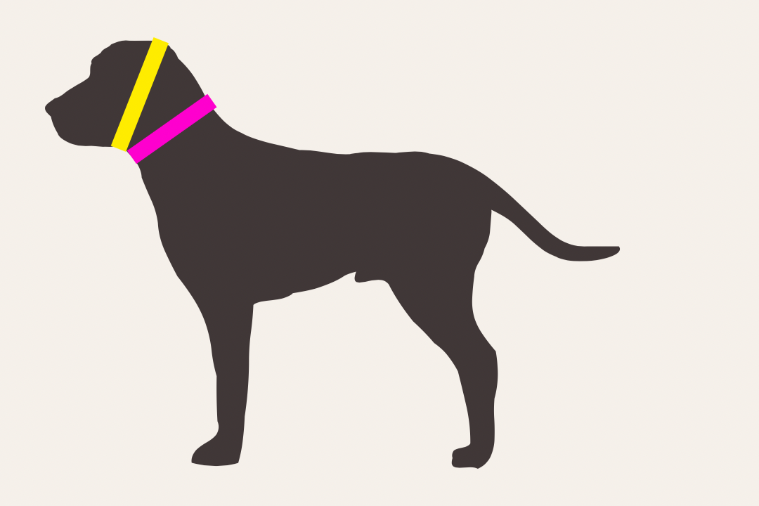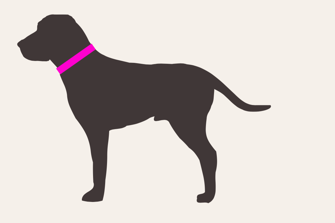 Den genauen Halsumfang (pink) deines Hundes misst du mit einem flexiblen Maßband am stehenden Hund (nicht liegend oder sitzend), genau an der Stelle, an der das Halsband später sitzen soll.