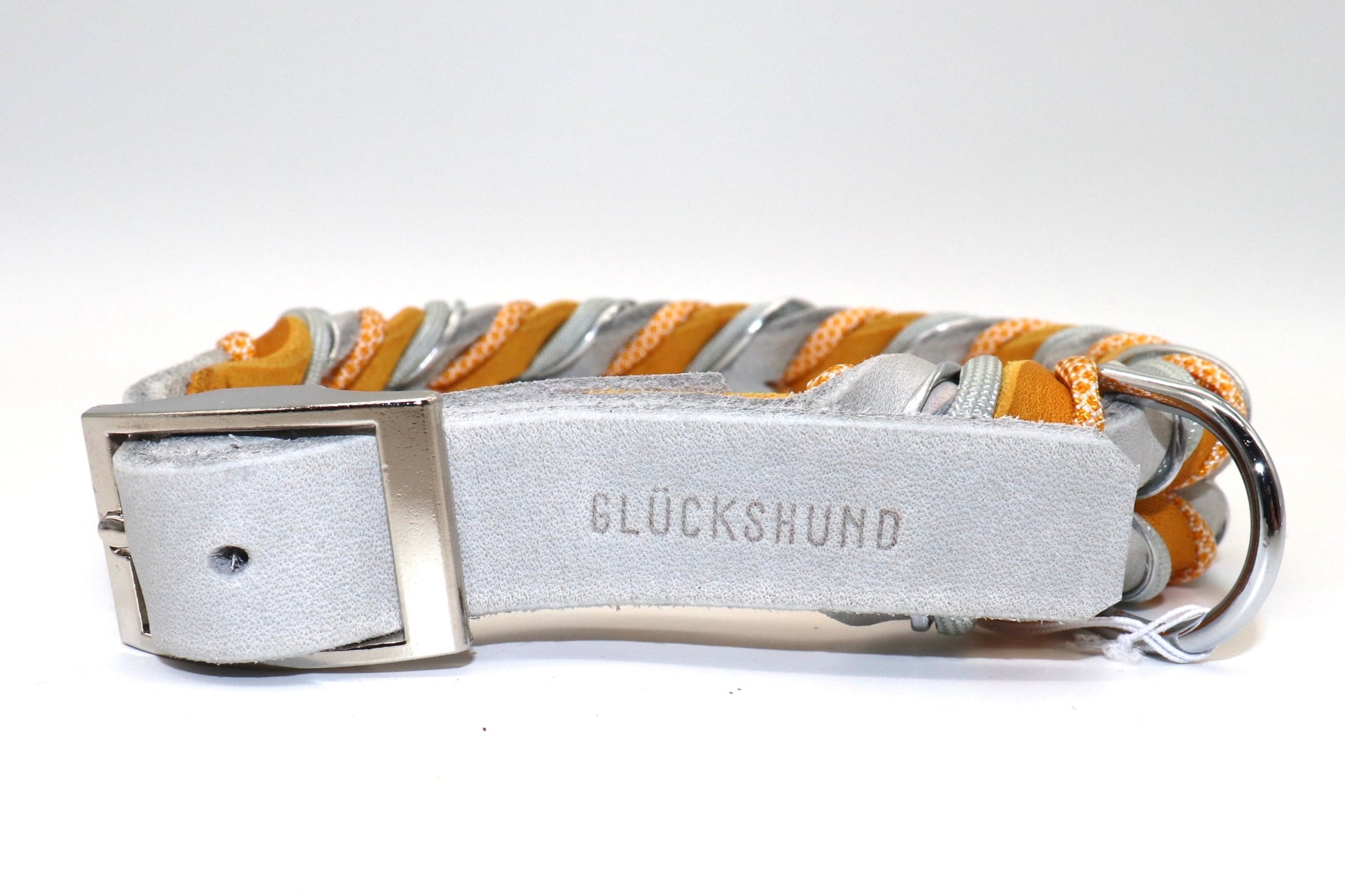 Unser handgefertigtes Hundehalsband Modell ZITRONENHAUCH aus hochwertigem Fettleder in einem frischen -doch zeitgleich edlem- Design ist pflegeleicht und eignet sich perfekt für eure alltäglichen Abenteuer. Die Kombination aus frischem Senfgelb / Curry und hellem Grau erinnert an erntefrische Zitronen und macht das Halsband zu einem echten Hingucker.